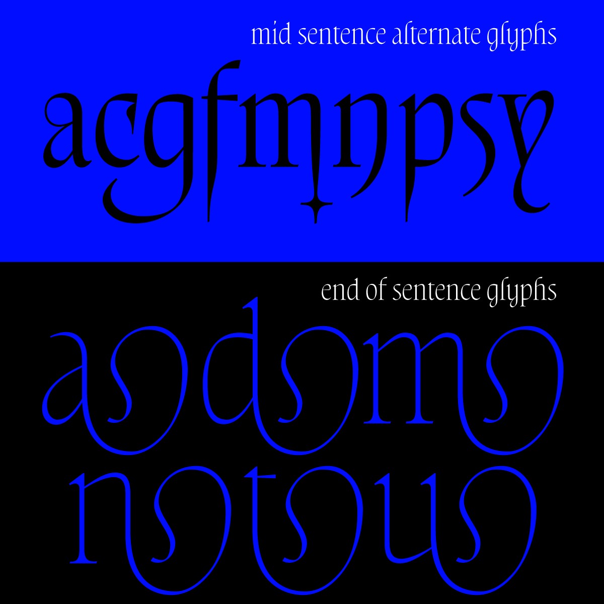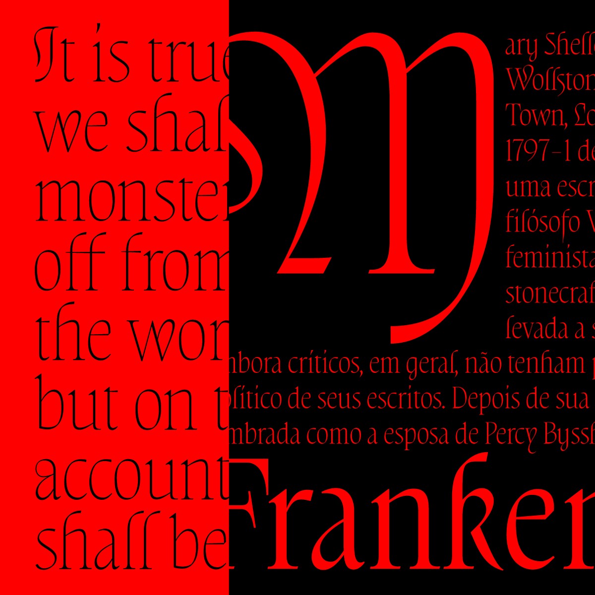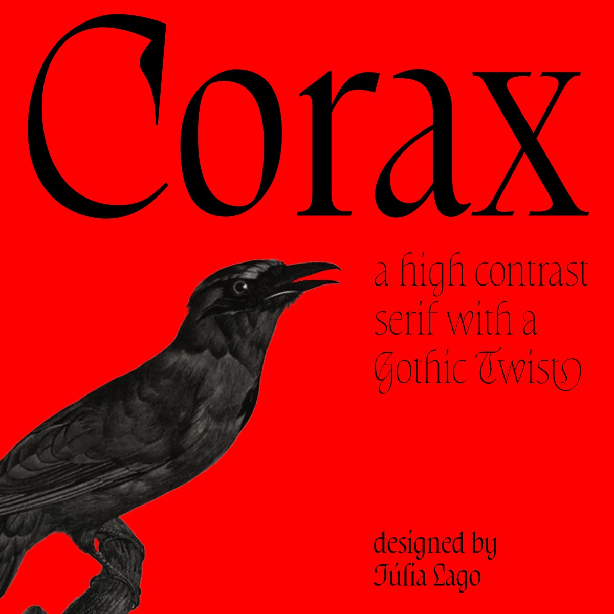 Corax is a sophisticated, high contrast, serif typeface that explores the italic construction in up-right letterforms. With calligraphic influences and an unexpected gothic twist, this beautiful Frankenstein will surely add a touch of drama and mystique to most applications. Designed to behave as a digital lettering, the current 3-weight family has several alternates, including a second set of ornamental capital letters. Want more? No worries, Júlia is working on bolder styles and real italics.